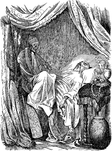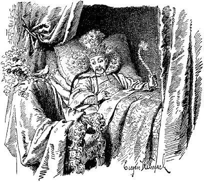 Бедный император почти не мог вздохнуть, и ему казалось, что кто-то сидит у него на груди. Он приоткрыл глаза и увидел, что на груди у него сидит Смерть. Она надела на себя корону императора, забрала в одну руку его золотую саблю, а в другую – богатое знамя. Из складок бархатного балдахина выглядывали какие-то странные лица: одни гадкие и мерзкие, другие добрые и милые. То были злые и добрые дела императора, смотревшие на него, в то время как Смерть сидела у него на груди.