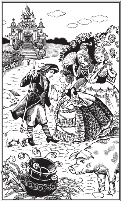 І фрейліни стали в коло, схопили руками кінчики своїх спідниць, щоб затулити їх від чиїхось поглядів. Свинопас одержав десять поцілунків принцеси, а принцеса – чудовий горщичок.