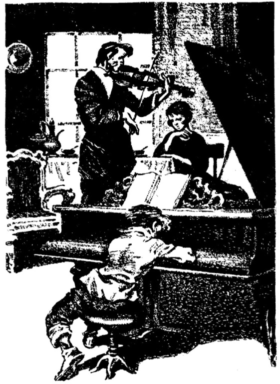В комнате есть еще книжный шкаф, набитый самыми разнообразными книгами, письменный стол, кресла, обтянутые бархатом, и такой же диван, а возле рояля – круглый черный вертящийся стул.