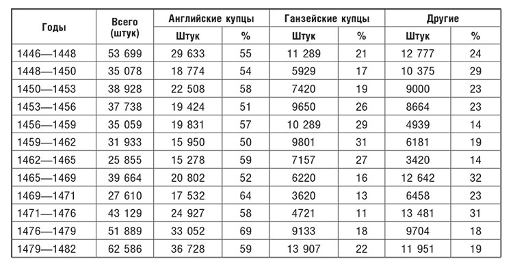 Таможенная статистика позволяет нам определить соответствующие доли английских, ганзейских и других иностранных купцов (последних данные различать не позволяют) в вывозе сукна из Англии во 2-й половине века (см. табл. 1.1). Вообще говоря, на протяжении всего этого периода английские купцы сохраняли небольшое преимущество (чуть более 50 %). К сожалению, неизвестно, какая часть этого экспорта пошла в страны Прибалтики. Во всяком случае, похоже, доля Балтийского региона была отнюдь не маленькой в отношении как английских, так и ганзейских купцов. Стоит также отметить, что данцигские купцы занимали 2-е место после Кёльна в общем объеме ганзейского экспорта сукна из Англии. Ткань широко распространялась в Польше, Литве и Малороссии (Украине), доставлялась на юг в Венгрию и Валахию и проникала даже до побережья Черного моря. С середины века Голландия также значительно увеличила экспорт тканей в Прибалтийские страны. Главной статьей импорта Англии из Прибалтики в XIV и XV вв. была продукция лесной промышленности, такая как различные виды древесины (Англия импортировала норвежскую и прусскую древесину еще в XIII в.), в особенности клепки, дубовые клепки, мачты, гнутые доски, смола, поташ и т. д. Следует также упомянуть зерно, привозимое в неурожайные годы. В отчетах Тевтонского ордена за 1404 г. указаны различные товары, вывезенные из Пруссии в Англию, в том числе 600 коржецов (1 коржец = 31/3 бушелей) пшеницы, 18 колод солода, 1 «сачик» и 450 000 дубовых досок. В отдельные годы количество зерна, импортируемого Англией из Данцига, был значительным: например, в 1441 г. он составлял 1100 ласт. Среди других товаров следует упомянуть лен, холст, медь (венгерскую), воск и т. д.