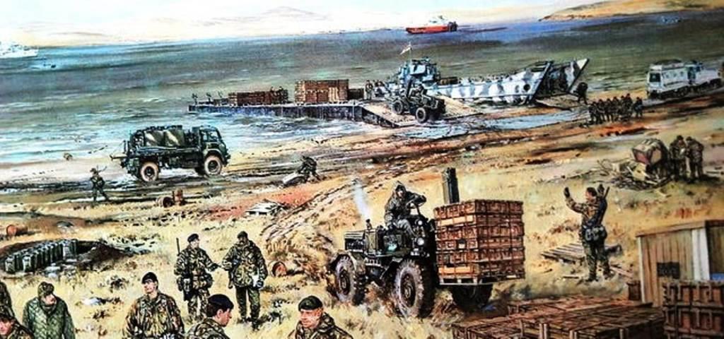 при высадке десанта в бухте Блафф-Коув в результате авианалета БДК «Сэр Тристрам» был подожжен, БДК «Сэр Галахэд» потоплен (прим. перев.)