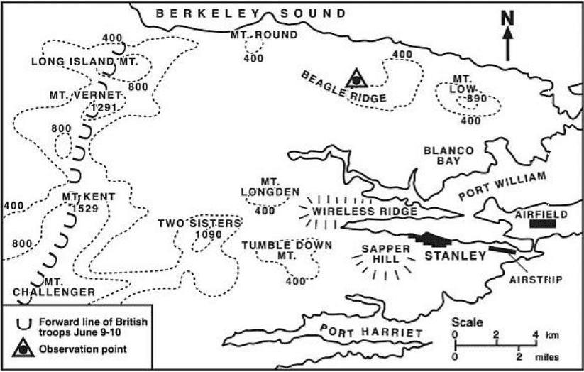 Результаты ночной стрельбы были очень хорошими. 155-мм пушка разбита и опрокинута, бросая вызов целым дням усилий расчета, снова развернуть ее в нужную сторону. В крышах офицерских квартир виднелись огромные дыры, а большая радарная тарелка, обращенная к морю, которую я заметил за этими зданиями, направленными на юг, больше не была видна. (Через несколько месяцев, вернувшись в Англию, я присутствовал на разведывательном разборе в главном здании Министерства обороны в Уайтхолле. На цветном слайде, сделанном кем-то после взятия Стэнли, эта радарная тарелка была перевернута и разбита. Разведчики подтвердили, что мои предположения были, в целом, верны. Этот радар, вероятно, был использован при успешной атаке «Экзосета» на эсминец «Глэморган» в начале той недели).