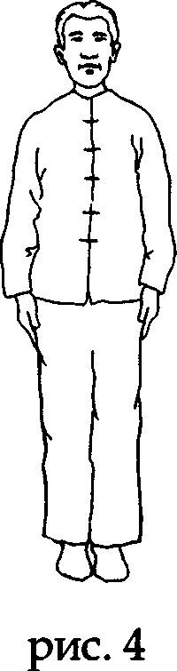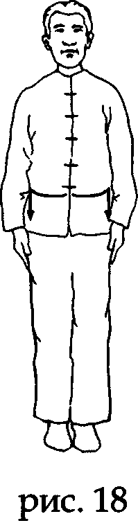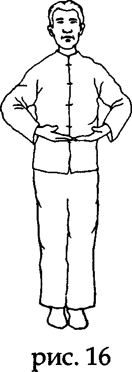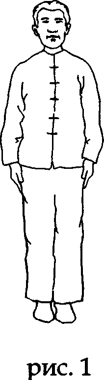 Встаньте ровно, носки и пятки вместе, колени выпрямлены, ладони на бедрах, взгляд через полуприкрытые веки направлен прямо перед собой (рис.1). В первую очередь, постарайтесь, чтобы макушка была как бы «подвешена» вверх, грудь опустите, копчик потяните вниз, расправив таким образом позвоночник. Кончик языка слегка касается верхнего неба. Зубы не плотно прижаты друг к другу, губы сомкнуты, но не напряжены. Сознание погрузите в область нижней части живота (ближе к позвоночнику). Эта область в китайской медицинской и алхимической традициях называют «полем киновари» (даньтянь)[3]3