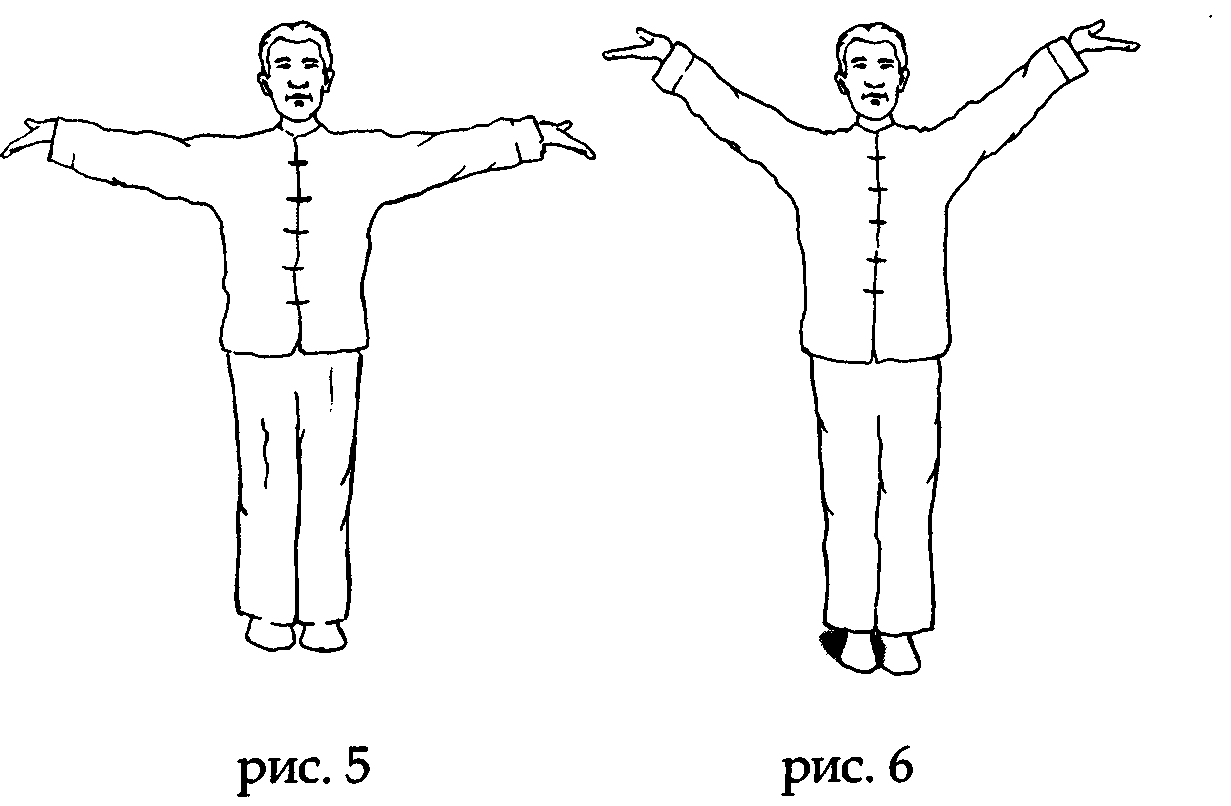 Дальше продолжающееся движение ладоней и макушки вверх приводят к отрыванию пяток от земли и плавному, естественному поднятию на носки. Конечное положение этой фазы движения называется «поддержать Небо» (то тянъ) (рис. 6).