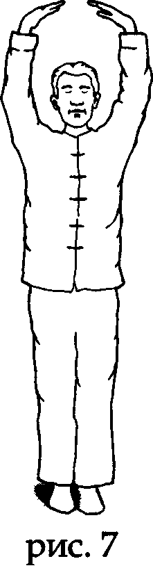 На задержке дыхания ладони поворачиваются к голове таким образом, чтобы точки лаогун были направлены на макушку (на точку байхуй) (рис. 7).