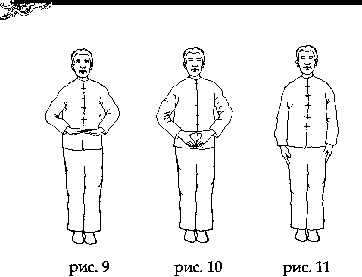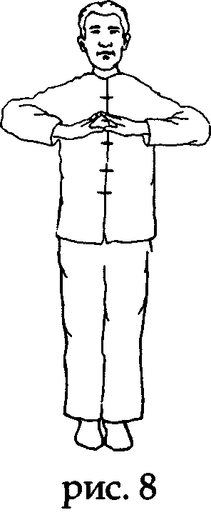 Важно отметить, что ладони опускаются вниз не в результате силового и волевого движения, а в результате расслабления локтей, которые как бы сами по себе разъезжаются в стороны, расслабление же плеч продолжает этот процесс «самостоятельного падения» ладоней (с долей небольшого притормаживания, как у падающего с дерева листа) в направлении области даньтянь (рис. 8).