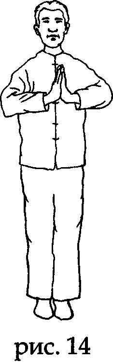 На выдохе опустите соединенные ладони до уровня груди (рис. 14). Следите за тем, чтобы ладони не находились слишком близко к груди (это вызовет напряжение в плечах), а также, чтобы не были слишком выставлены вперед (это вызовет напряжение в спине). Ладони слегка давят друг на друга, плечи, локти, грудь и спина расслаблены.