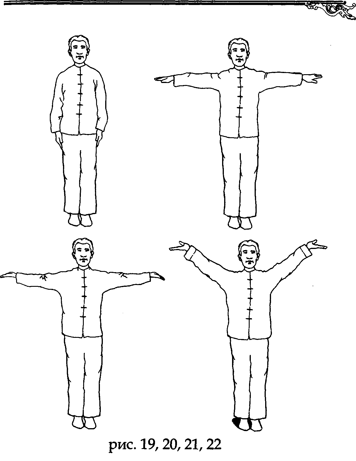 На вдохе, руки ладонями вниз поднимаются по сторонам вверх до уровня плеч (рис. 20).