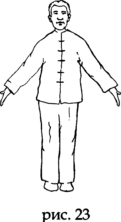 Дальше продолжающееся движение ладоней и макушки вверх приводят к отрыванию пяток от земли и плавному, естественному поднятию на носки, (рис. 22).