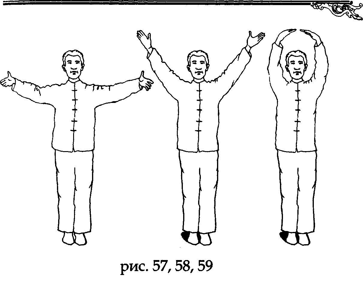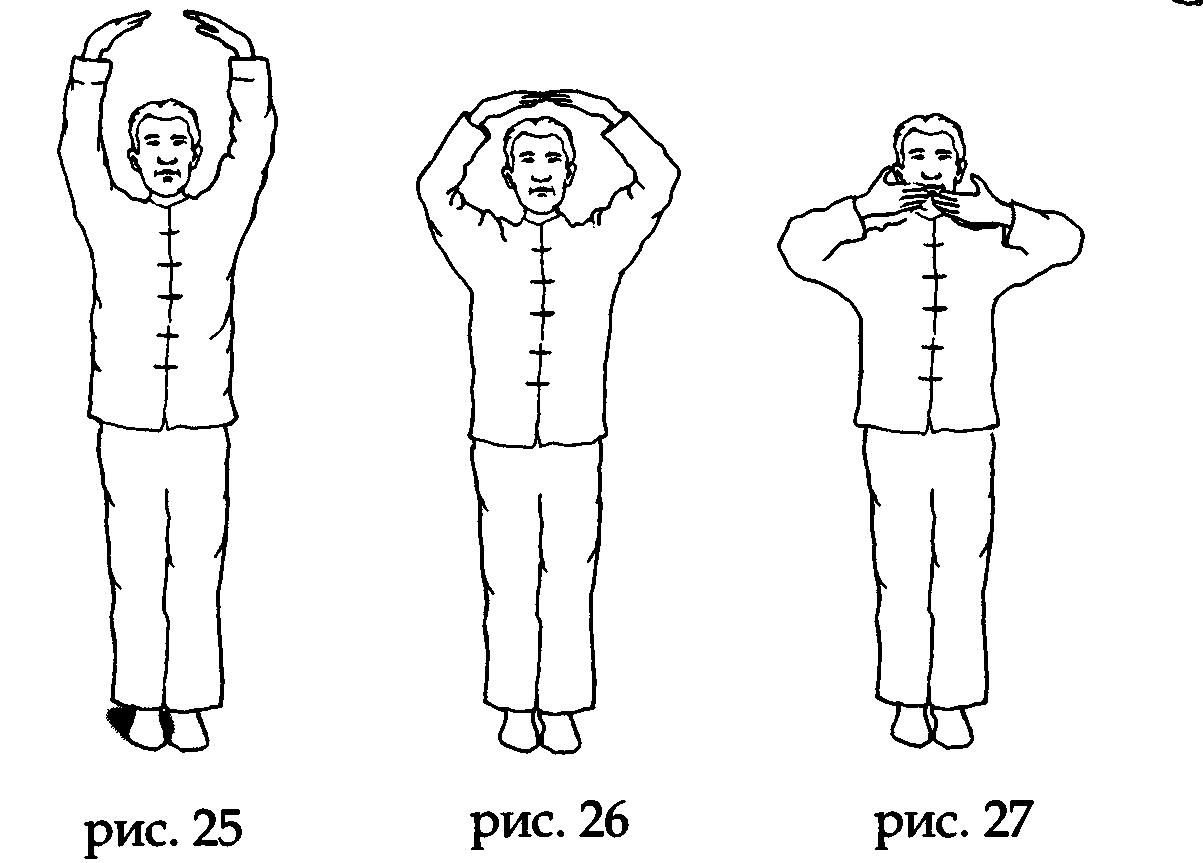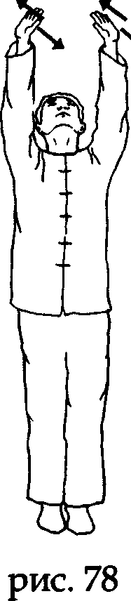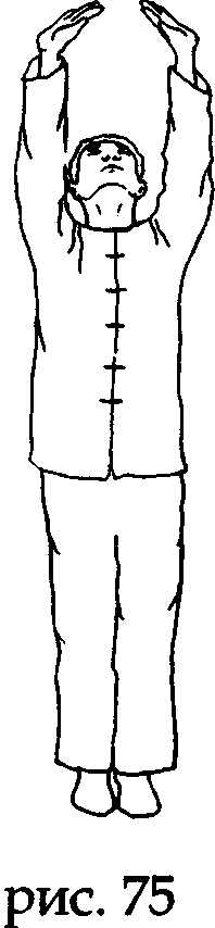 Продолжая вдох, поднимите руки над головой, «поддерживая Небо», а затем разверните ладони пальцами назад и поднимите голову вверх. Постарайтесь, чтобы ваше сознание через обращенные к Небу глаза (так называемый«дух глаз») создало связь (видимую или воображаемую) с субстанцией Неба (рис. 74, 75).