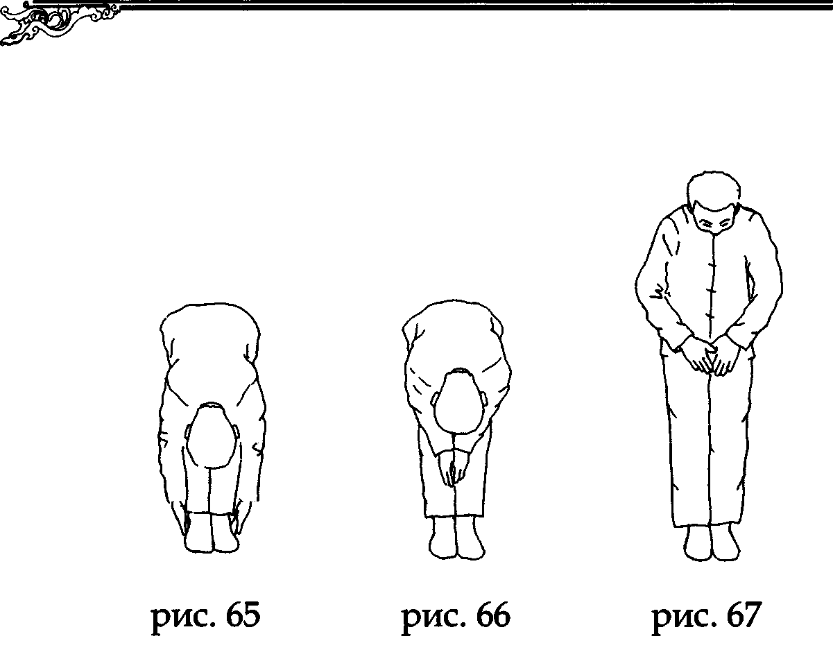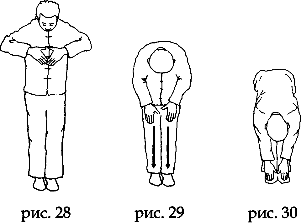 Все еще не начиная делать выдох, опустите руки вдоль средней линии лица сначала под нос (где завершается канал думай), а затем (по каналу жэнъмай) к надгрудинной ямке (у яремной впадины), коснитесь ее кончиками соединенных средних пальцев (рис. 27). На выдохе сначала опустите голову и начинайте делать наклон вниз, шейные, грудные и поясничные позвонки последовательно сгибаются друг за другом.