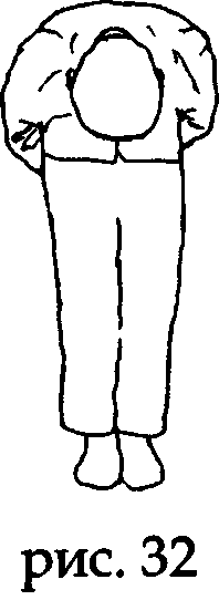 На вдохе, также поочередно, от позвонка к позвонку, но уже снизу вверх, начинаем постепенно распрямляться. Руки перемещаются по центральной линии вдоль задней поверхности ног (рис. 32).