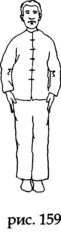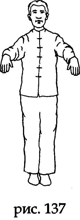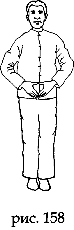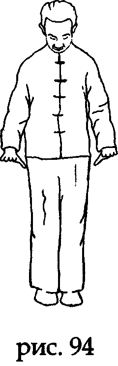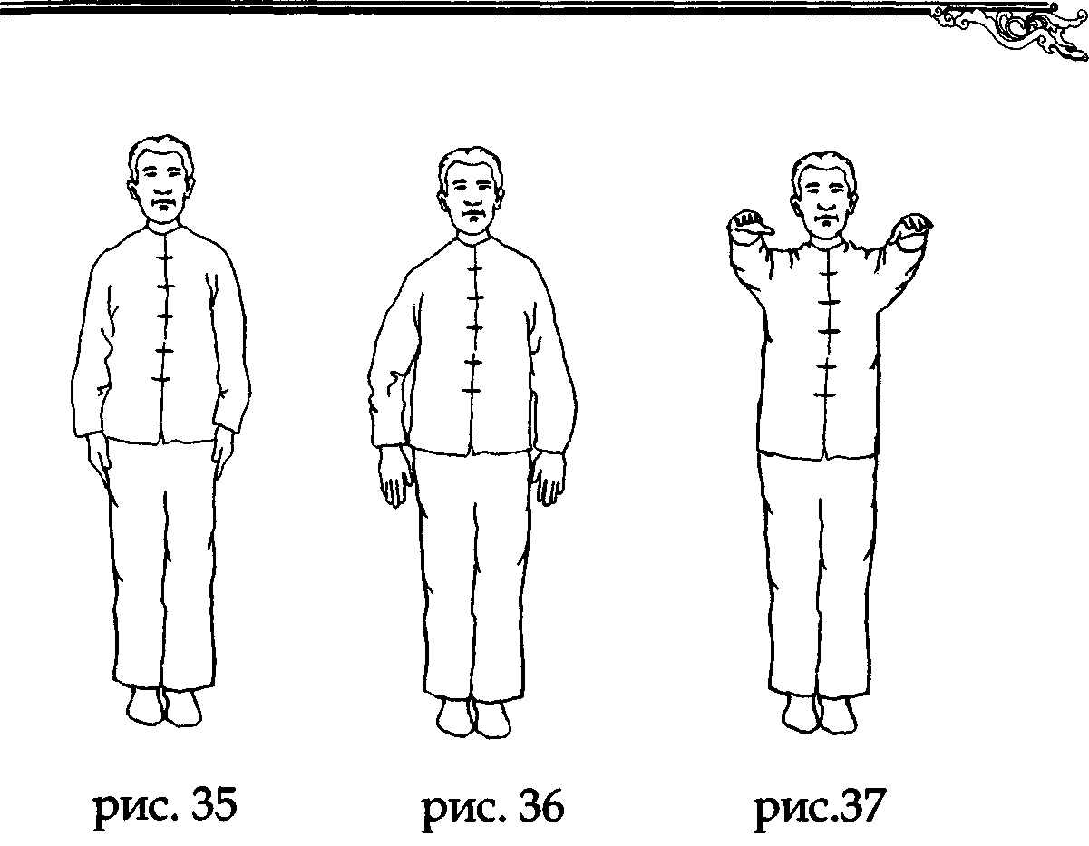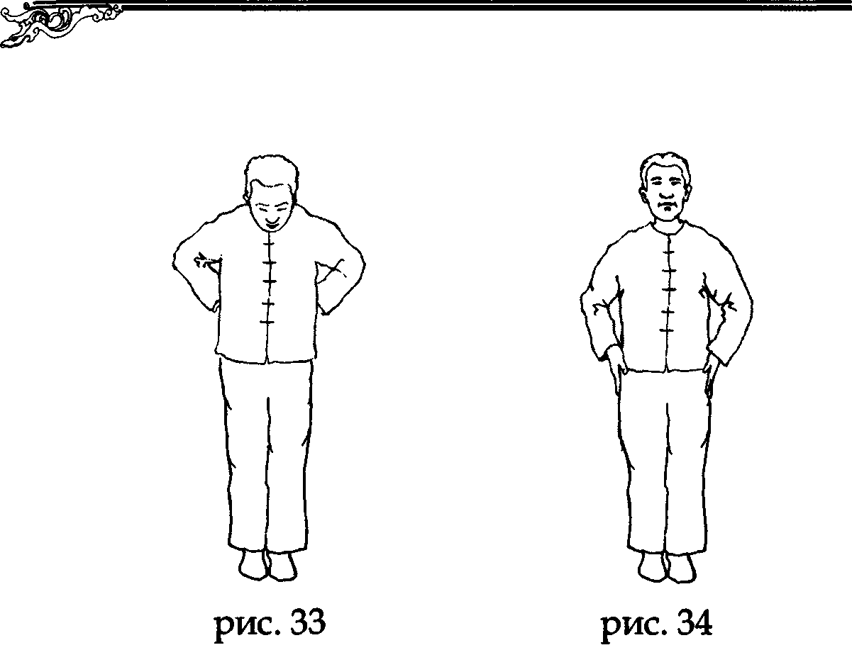 На выдохе, проведя ладонями по поясному меридиану (даймай), возвращаем их в исходное подготовительное положение вдоль бедер (рис. 34).