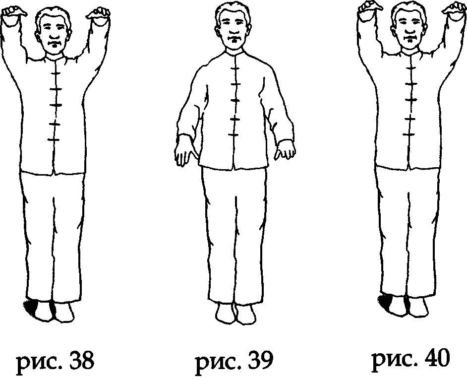 Продолжая вдох, поднимите руки чуть выше головы, при этом за счет усилия макушки оторвите пятки от земли (рис. 38).