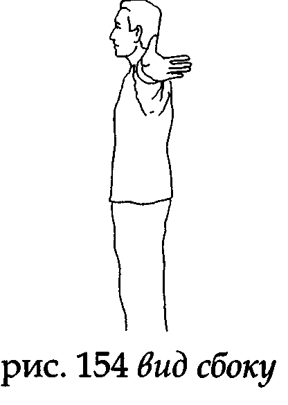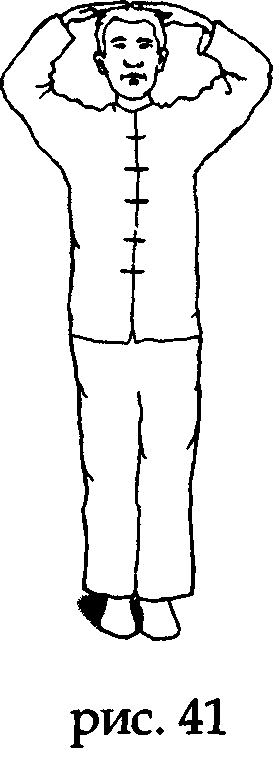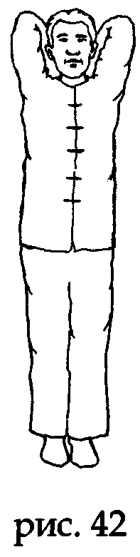 На выдохе встаньте на пятки и опустите соединенные кончики средних пальцев вдоль центральной линии затылочной части головы до уровня седьмого шейного позвонка, слегка коснитесь точки дачжуй (у основания 7-го шейного позвонка) (рис. 42).