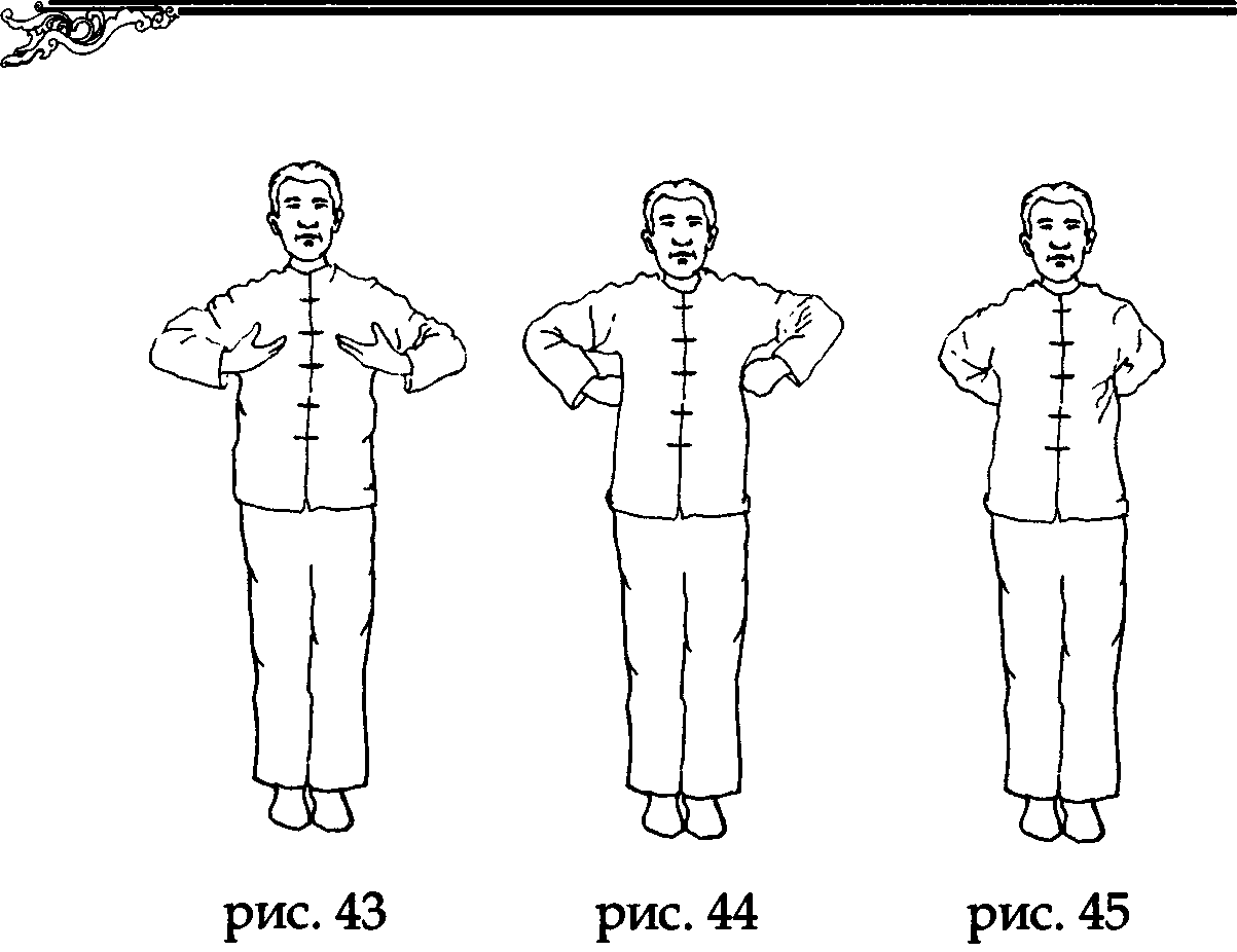 На вдохе проведите кончики пальцев к подмышкам, а затем соедините тыльные части кистей за спиной, слегка потянитесь пальцами к точке дачжуй (рис. 43,44,45).