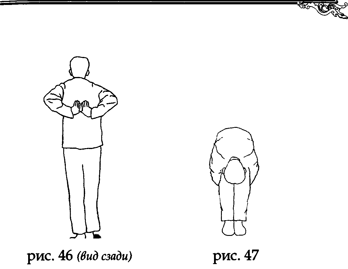 Руки в соединенном положении, касаясь пальцами тела, следуют вдоль центральной линии спины до копчика, после чего расходятся в стороны и движутся по задней центральной линии ног вниз к пяткам (рис. 47).
