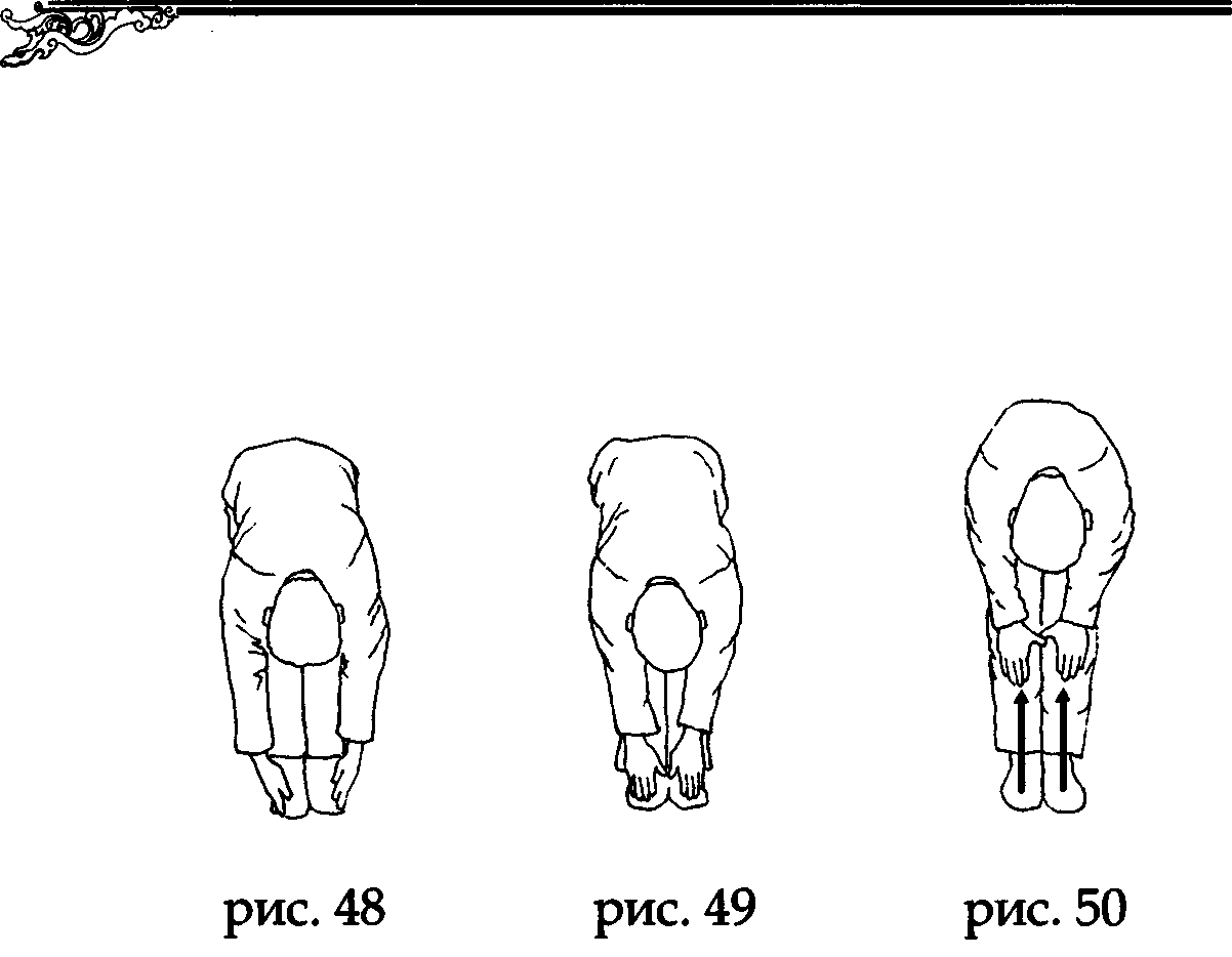 Завершая выдох, расслабьте поясницу и переместите ладони по наружным краям стоп от пятки к пальцам. Затем положите ладони на ступни, совместив точки лаогун ладоней с проекциями точек юнцюанъ на тыльной стороне стопы (рис. 48,49).