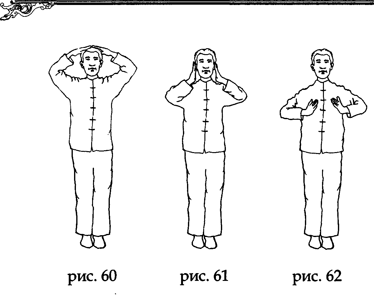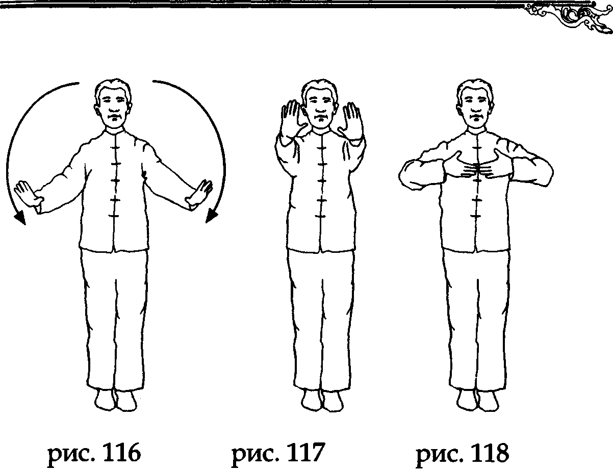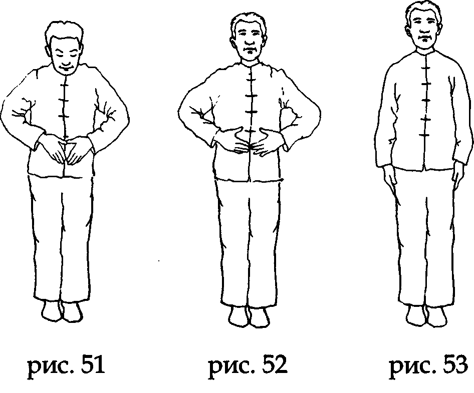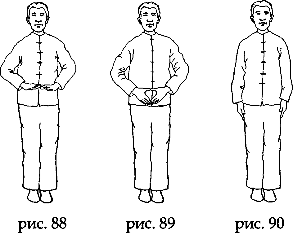 На выдохе разведите ладони в стороны по горизонтали, как бы охватывая Землю, а на вдохе соберите ладонями Земную ци и, соединив указательные и большие пальцы в форме треугольника, направьте ее в нижний данътянъ. Задержите руки в таком положении и мысленно досчитайте до трех, после чего разъедините руки и верните их в исходное положение по бокам бедер (рис. 104,105,106).