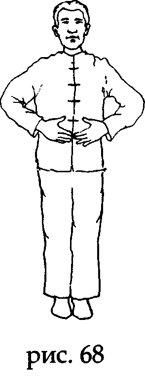 В области лобка основания ладоней расходятся, а соединенные кончики средних пальцев накладываются на пупок. Замрите в этом положении и мысленно сосчитайте до трех (рис. 67,68).