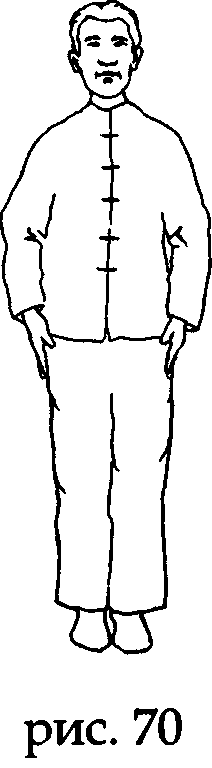 Встаньте прямо, носки и пятки вместе, ладони вдоль туловища, колени выпрямлены, макушка «подвешена» (рис 71).