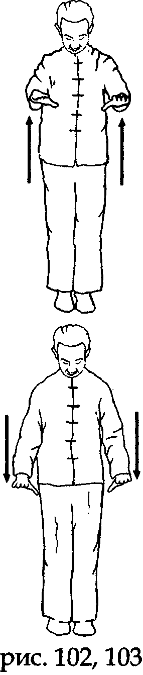 На вдохе сначала поверните руки ладонями назад, а затем выведите их чуть вперед и направьте ладони вниз параллельно Земле. Одновременно с этим слегка наклоните голову и сконцентрируйте «дух глаз» на субстанции Земли (рис. 92).
