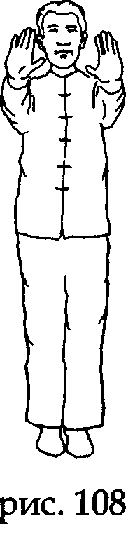 На вдохе сначала поверните руки ладонями назад, поднимите их ладонями вниз прямо перед собой до уровня плеч, а затем поставьте ладони вертикально (рис. 108).