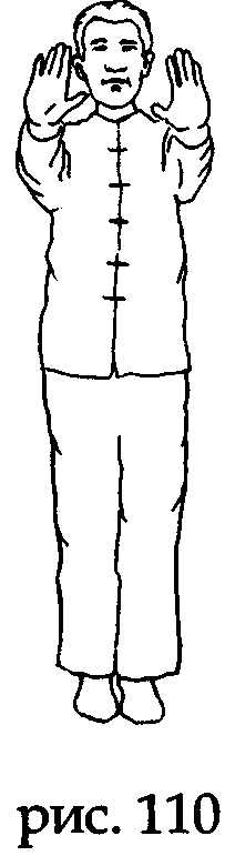 На выдохе разведите руки по горизонтали, не меняя направления ладоней на Юг, затем на вдохе снова сведите их. Выполните эти движения по три раза (рис. 109,110).