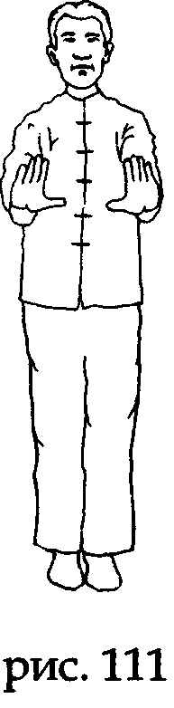 После возвращения рук в положение прямо перед собой, на выдохе опустите их вниз до уровня живота (не меняя направления ладоней на Юг). Затем на вдохе поднимите их по вертикали до уровня головы. Выполните эти движения по три раза (рис. 111,112).