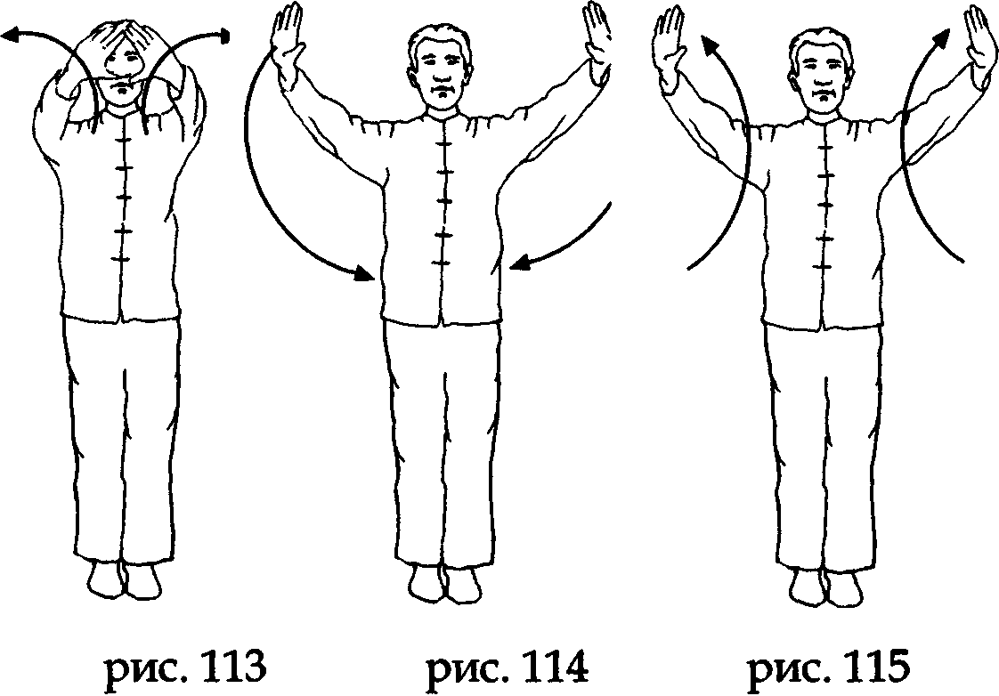 По возвращению рук в положение прямо перед собой, на вдохе, не меняя направления ладоней, начните делать вращательные движения по кругу. Первая половина круга (вверх и от себя) выполняется на вдохе, вторая половина круга – на выдохе (вниз и к себе). Сделав таким образом три круга, проделайте еще три круга в обратном направлении, то есть пол круга на выдохе – вниз и от себя, пол круга на вдохе – вверх и к себе (рис. 113,114,115,116).
