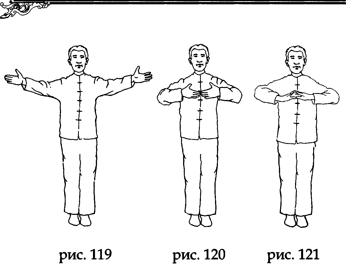 На выдохе широко разведите руки в стороны на уровне плеч, не меняя направления ладоней, а на вдохе соберите ци Юга, направив ладони в средний даньтянь (рис. 119,120).