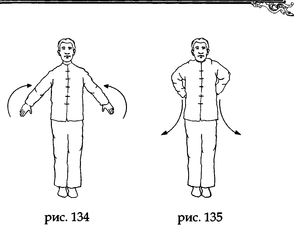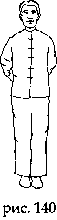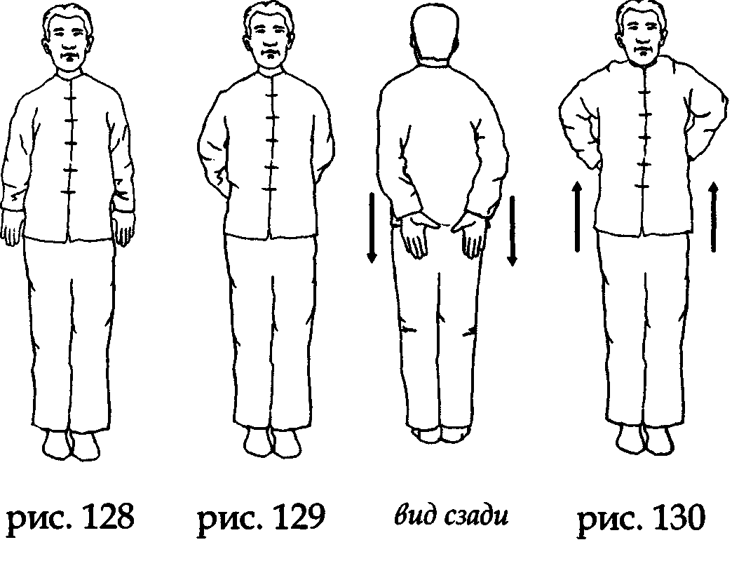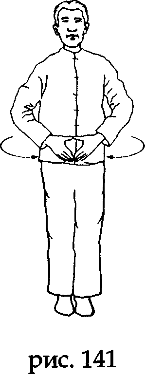 На выдохе разведите руки в стороны, не меняя направления ладоней, а на вдохе соберите ци Севера в зону минмэнъ (в районе почек), положив ладони на поясницу и «прогревая» ее через точки лаогун (рис. 139,140).