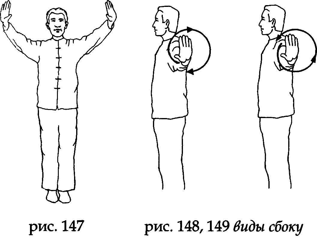 Затем, по возвращению рук в первоначальное положение, на вдохе, не меняя направления ладоней, начните делать круговые движения. Первая половина круга (вверх и назад) вьшолняется на вдохе, вторая половина круга – на выдохе (вниз и вперед). Сделав таким образом три круга, проделайте еще три круга в обратном направлении, то есть пол круга на выдохе – вниз и назад, пол круга на вдохе – вверх и вперед (рис. 148,149).