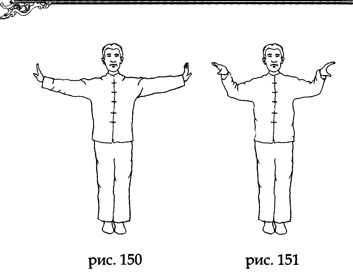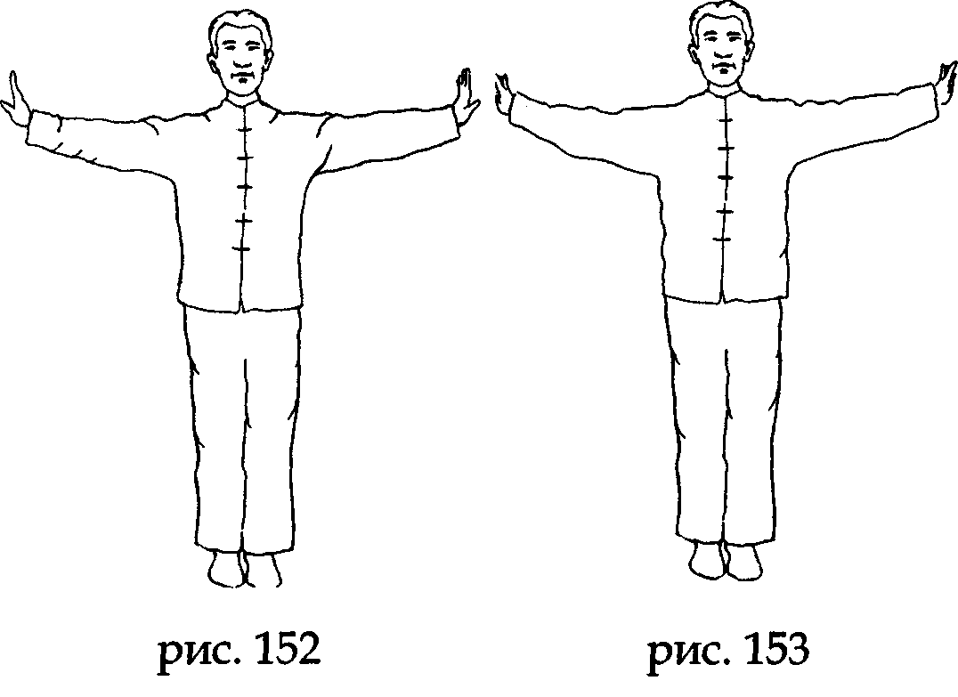 После возвращения рук в первоначальное положение, начинайте на вдохе, слегка сгибая руки в локтях, затягивать через точки лаогун энергию Востока и Запада, внутренне направляя ее нижний данътянъ (при этом не меняйте направление ладоней). Акцент делается только на вдохе, о небольшом выдохе при распрямлении рук старайтесь не думать. Выполните эти движения по три раза (рис. 150,151,152).