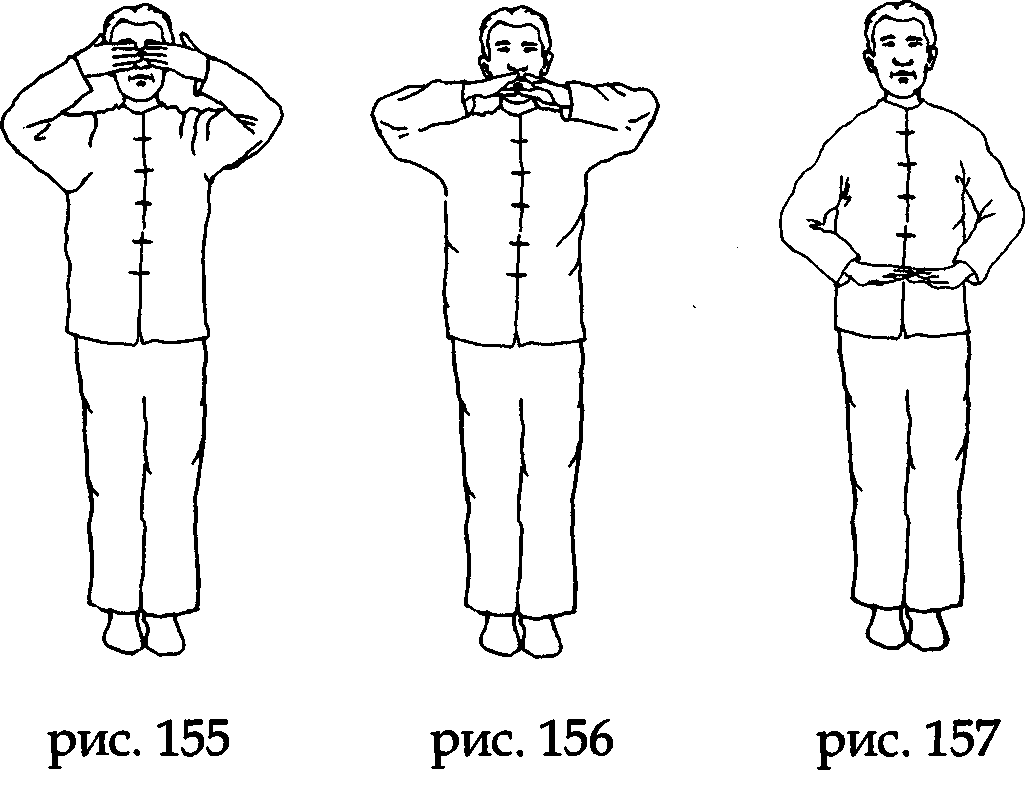 На выдохе поверните ладони пальцами назад, не меняя направления ладоней, а на вдохе соберите ци Востока и Запада в зону интан (между бровями) (рис. 153,154,155).