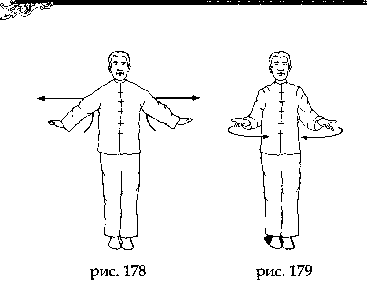На задержке дыхания направьте кончики средних пальцев на точку шэньцюэ (см. приложение), задержитесь в этом положении и сосчитайте до трех. Ладони остаются обращенными вверх (рис. 178,179,180).