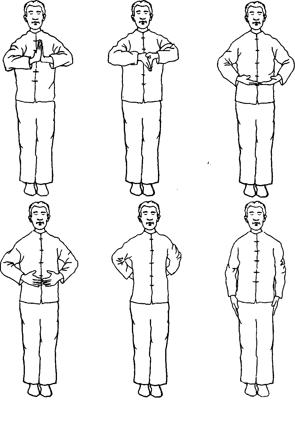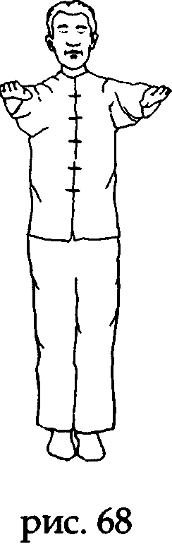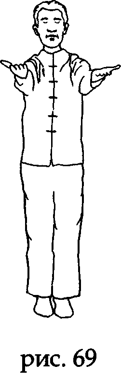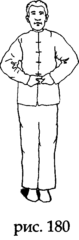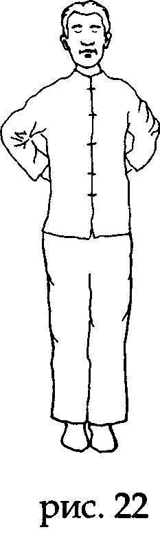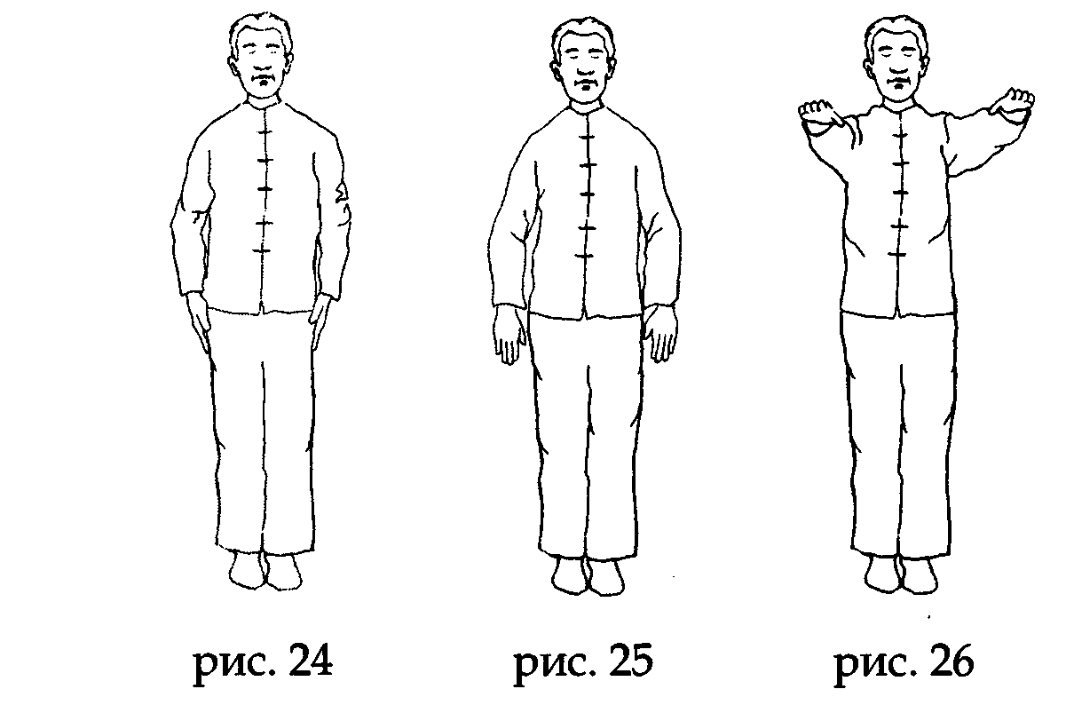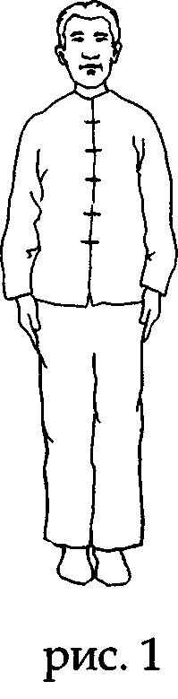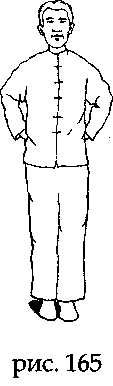 1. Встаньте лицом на восток или на юг, пятки и носки вместе. Руки естественно свисают вдоль бедер, кончики средних пальцев слегка касаются точек фэнши (смотри приложение).