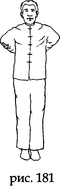 На выдохе, не отрывая кончики пальцев от поверхности тела, переместите их на точку минмэнъ. Одновременно с этим опуститесь на пятки. Задержитесь в этом положении и сосчитайте до трех (рис. 181).