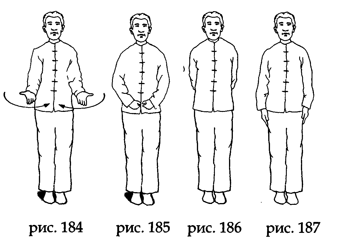 На вдохе руки ладонями вверх снова вытяните назад, но уже на уровне копчика. Одновременно с этим поднимитесь на носки. Продолжая вдох и не меняя положение ладоней, переместите руки по кругу до уровня бедер, локти обращены вверх. Переверните руки локтями вниз, тогда ваши ладони снова окажутся обращенными вверх и продолжайте движение рук вперед по кругу к области лобка. На задержке дыхания направьте кончики средних пальцев на точку гуаньюань, задержитесь в этом положении и сосчитайте до трех. Ладони остаются обращенными вверх (рис. 182,183,184,185).