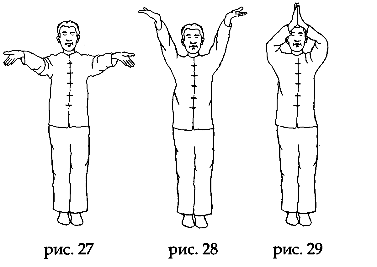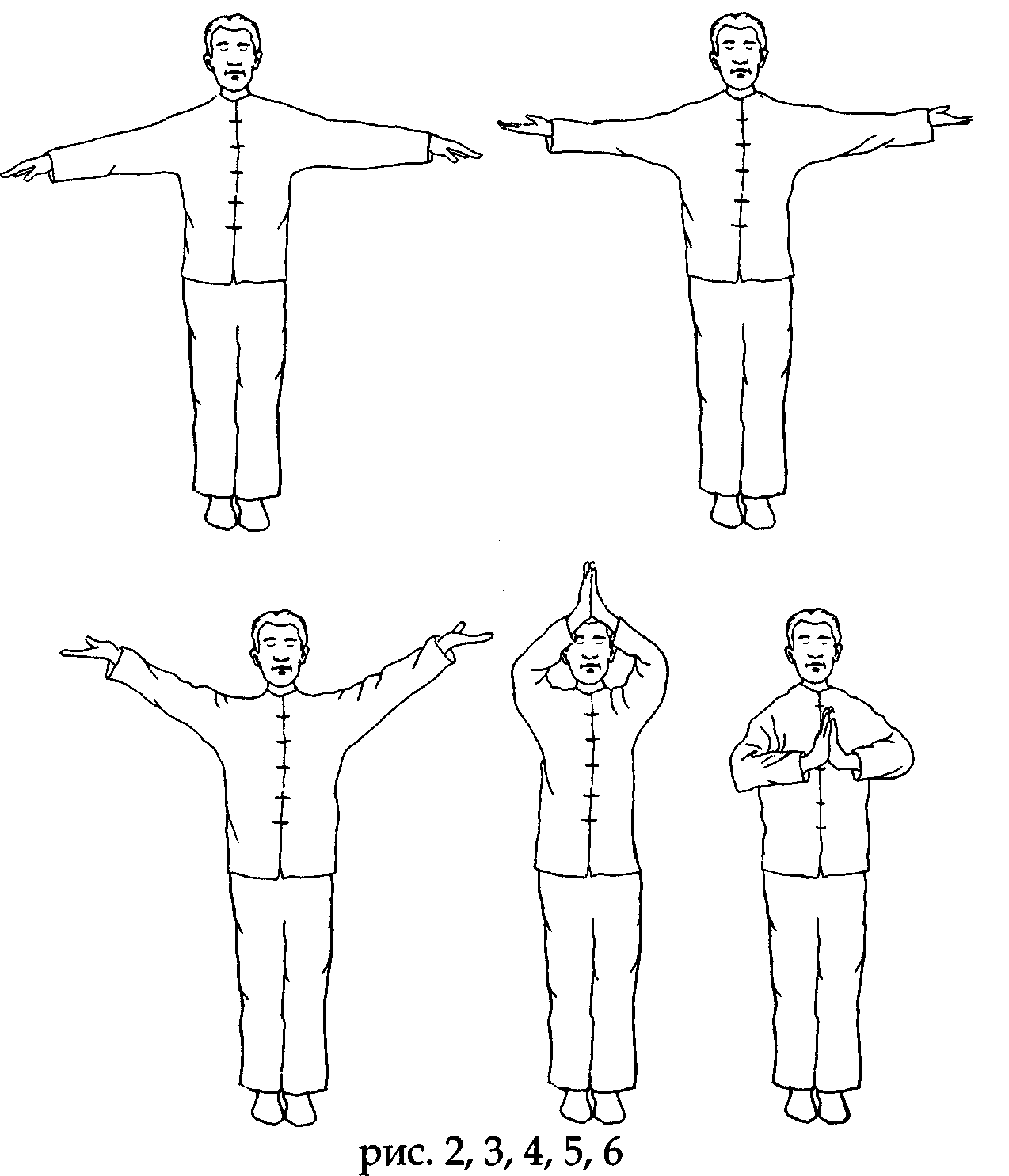 На вдохе руки ладонями вниз медленно поднимите по сторонам до уровня плеч. Переверните руки ладонями кверху (сначала основание большого пальца, затем указательного, среднего, безымянного и мизинца) и поднимите их над головой, "поддерживая Небо" (рис. 2, 3, 4).