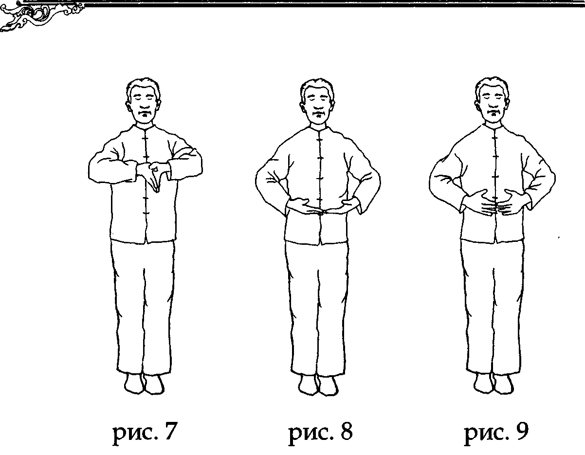 На задержке дыхания основания ладоней разъедините, оставив соединенными только кончики средних пальцев. Ладони смотрят вверх. Поверните руки ладонями к животу, кончиками средних пальцев легко надавите на пупок, медленно считая: один, два, три (рис. 7, 8, 9).