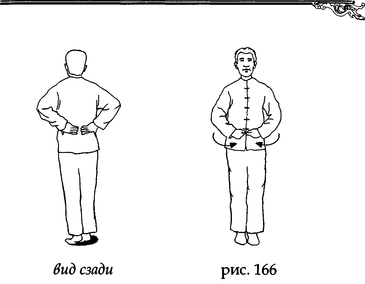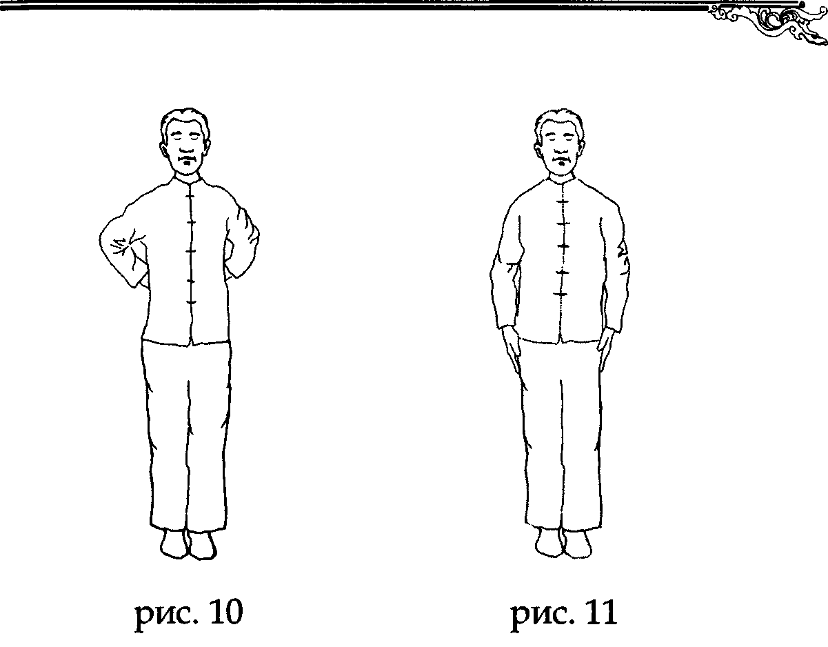 Из предъщущего положения кончики средних пальцев разъедините и ведите их по обеим сторонам вдоль меридиана даймай (по поясу) до точки минмэнъ (напротив пупка на спине). Три раза нажмите на нее, медленно считая: один, два, три. На выдохе верните руки в исходное положение (рис. 10,11).