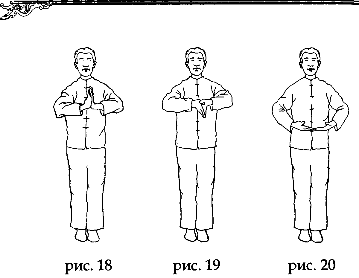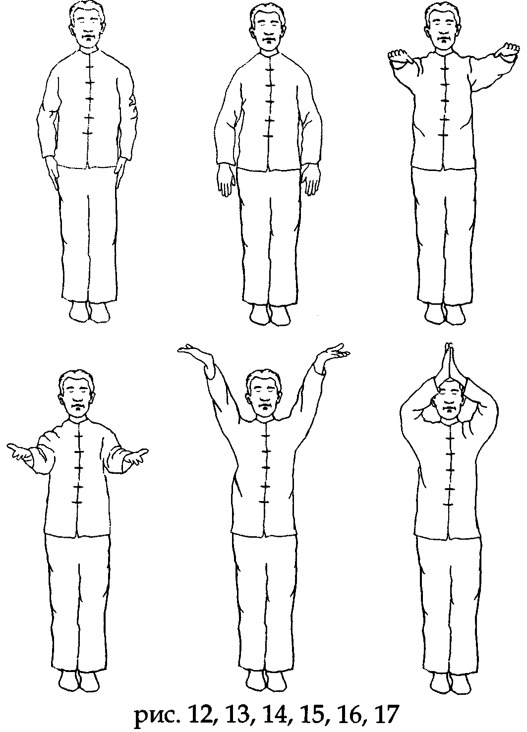Из исходного положения поверните руки ладонями назад (от основания мизинца к основанию большого пальца). Медленно на вдохе поднимите руки перед собой до уровня плеч. Ладони смотрят вниз. Переверните руки ладонями кверху (сначала основание большого пальца, затем указательного, среднего, безымянного и мизинца) и поднимите их над головой, "поддерживая Небо", а затем соедините ладони над головой (рис. 12,13,14,15,16,17). На выдохе, согнув локти, опустите их до уровня груди. Основания ладоней и средние пальцы плотно прижаты друг к другу, кончики пальцев смотрят вверх. Внутренним зрением посмотрите на сердце и медленно считайте: один, два, три, четыре, пять, шесть, семь, восемь, девять. Глаза расслабьте. На вдохе ладони переверните пальцами вниз и опустите кончики пальцев до уровня пупка. На задержке дыхания основания ладоней разъедините, оставив соединенными только кончики средних пальцев. Ладони смотрят вверх. Поверните руки ладонями к животу, кончиками средних пальцев легко надавите на пупок, медленно считая: один, два, три.