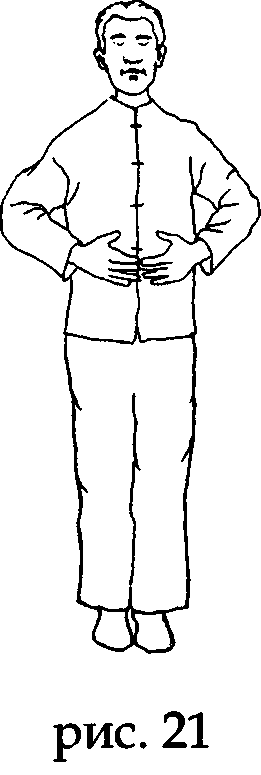 Глаза медленно закрыть и расслабить. Ладони на вдохе переверните пальцами вниз и опустите кончики пальцев до уровня пупка. На задержке дыхания основания ладоней разъедините, оставив соединенными только кончики средних пальцев. Ладони смотрят вверх. Поверните руки ладонями к животу, кончиками средних пальцев легко надавите на пупок, медленно считая: один, два, три. Из этого положения кончики средних пальцев разъедините и ведите их по обеим сторонам вдоль меридиана даймай (по поясу) до точки минмэнъ (напротив пупка на спине). Три раза нажмите на нее, медленно считая: один, два, три. На выдохе верните руки в исходное положение (рис. 53,54,55,56,57,58).