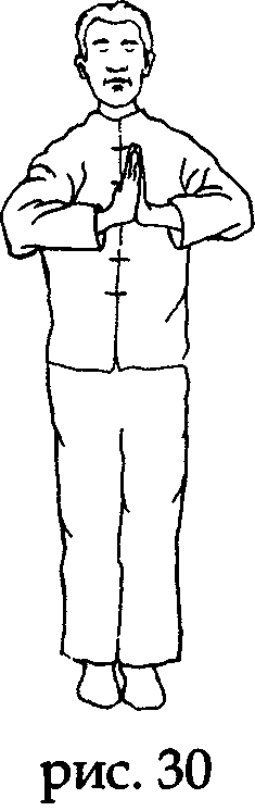 На выдохе, согнув локти, опустите их до уровня груди. Основания ладоней и средние пальцы плотно прижаты друг к другу, кончики пальцев смотрят вверх. Внутренним зрением посмотрите на парные точки юнцюанъ (смотри приложение) и медленно считайте: один, два, три, четыре, пять, шесть, семь, восемь, девять. Глаза расслабьте (рис. 30).