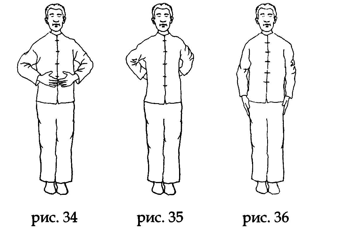 Из этого положения кончики средних пальцев разъедините и ведите их по обеим сторонам вдоль меридиана даймай (по поясу) до точки минмэнъ (напротив пупка на спине). Три раза нажмите на нее, медленно считая: один, два, три. На выдохе верните руки в исходное положение (рис. 31,32,33,34,35,36).
