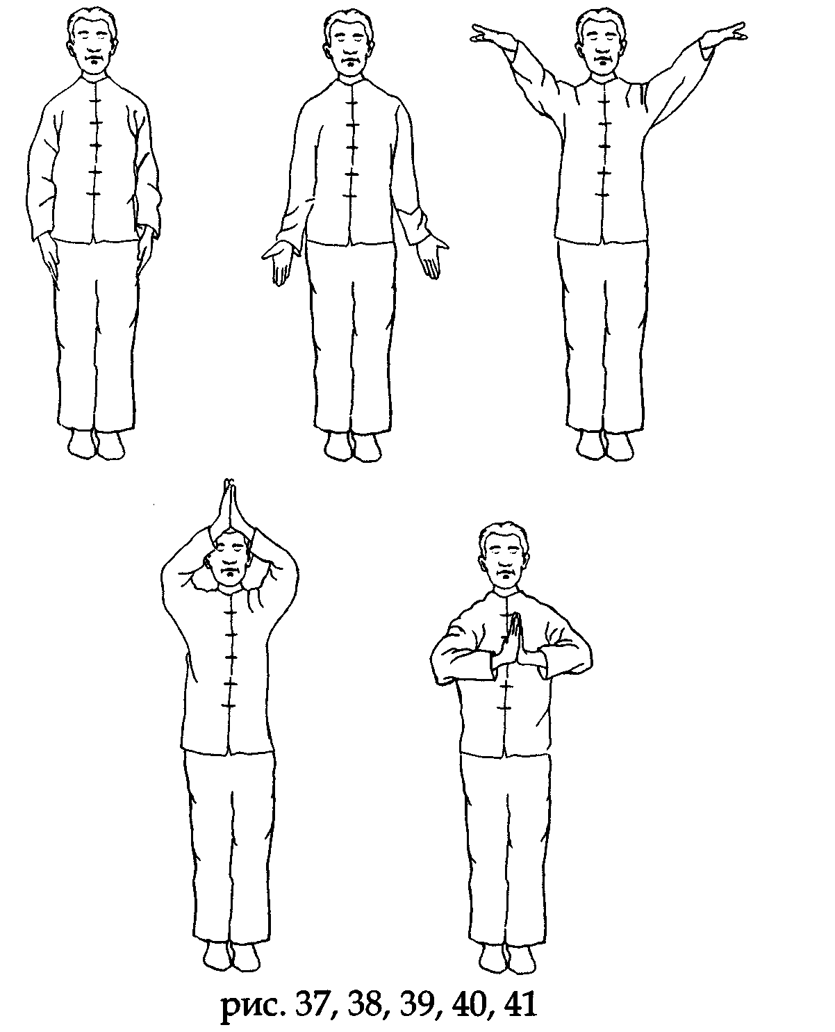 Не открывая глаз, поверните руки ладонями вперед (от основания большого пальца к основанию мизинца). На вдохе медленно поднимите руки перед собой до уровня плеч. Ладони смотрят вверх. Поднимите руки над головой, «поддерживая Небо». На задержке дыхания соедините ладони над головой (рис. 37,38,39,40).