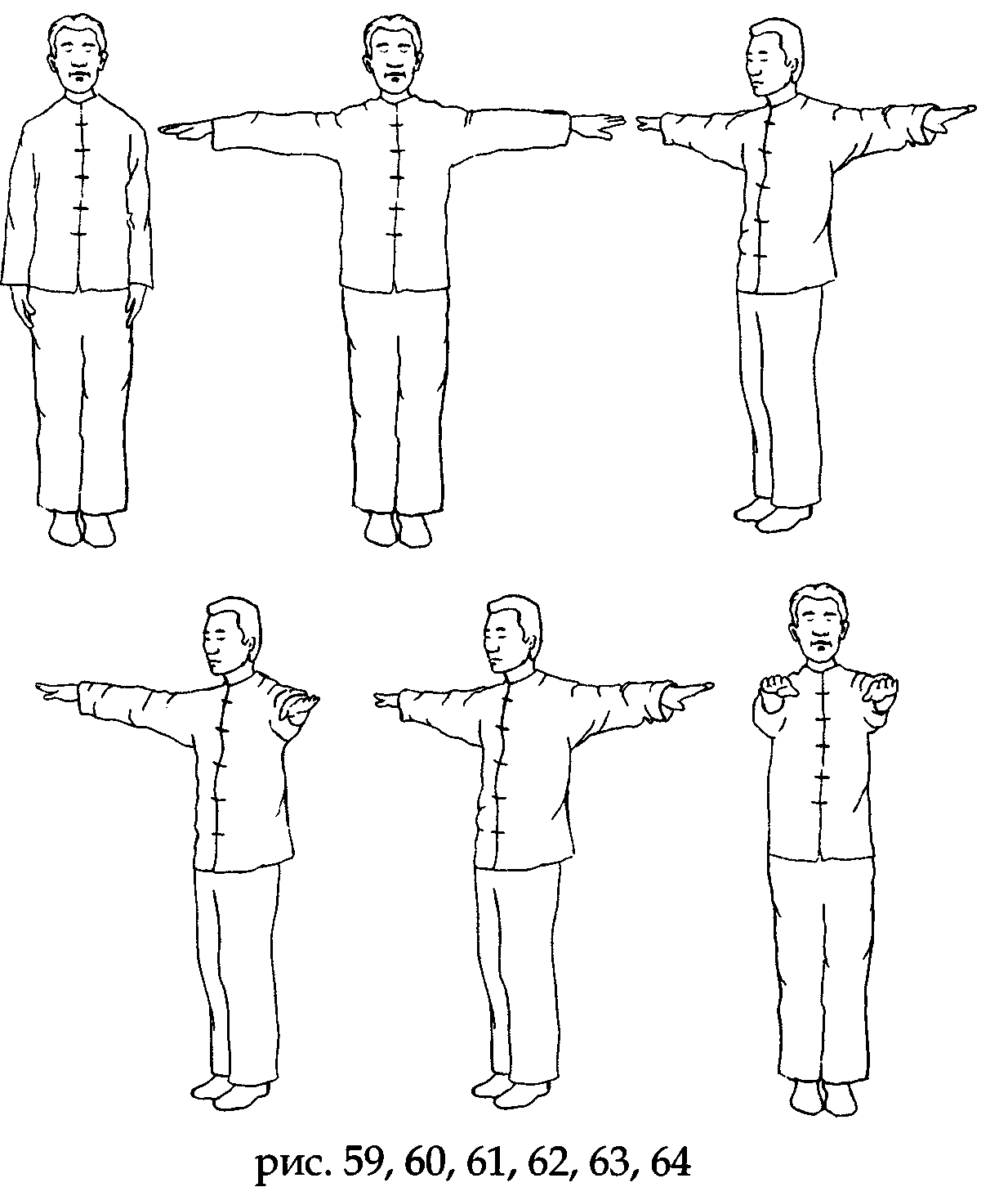 На вдохе поднимите руки в стороны до уровня плеч. Ладони смотрят вниз (рис. 59, 60).