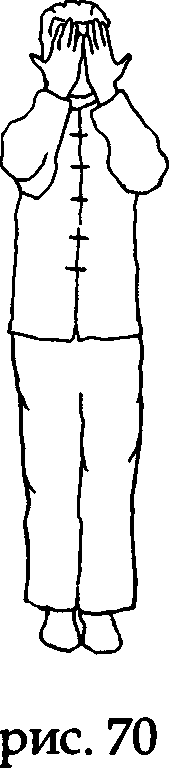 Опустите ладони вниз так, чтобы средние пальцы остановились на уровне подбородка. Соедините ладони вместе и на выдохе опустите их до уровня груди. Кончики пальцев смотрят вверх. Глаза расслабить (рис. 71, 72).