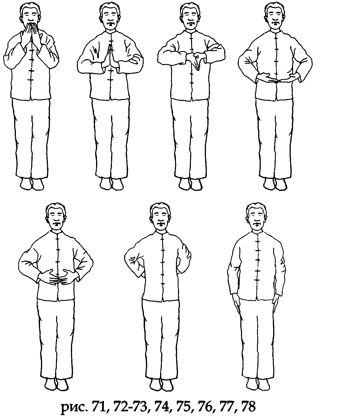 Ладони на вдохе переверните пальцами вниз и опустите кончики пальцев до уровня пупка. На задержке дыхания основания ладоней разъедините, оставив соединенными только кончики средних пальцев. Ладони смотрят вверх. Поверните руки ладонями к животу, кончиками средних пальцев легко надавите на пупок, медленно считая: один, два, три. Из этого положения кончики средних пальцев разъедините и ведите их по обеим сторонам вдоль меридиана даймай (по поясу) до точки минмэнъ (напротив пупка на спине). Три раза нажмите на нее, медленно считая: один, два, три. На выдохе верните руки в исходное положение (рис. 73, 74, 75, 76, 77, 78).